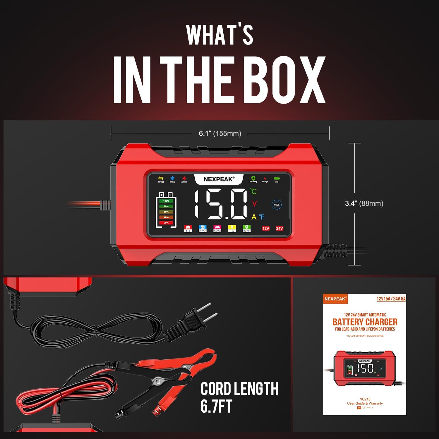 - 【BATTERY CHARGER LiFePO4/LEAD-ACID】Car battery charger 12V 15A and 24V 8A, charging speed is much faster than 8A automatic chargers. Car battery chargers charge or repair all LiFePO4 or lead acid 12v and 24v automotive, marine and deep cycle batteries, including AGM, GEL, SLA, floodable batteries in cars, trucks, SUVs, motorbikes, lawnmowers, boats etc. NEW REPLACEMENT AVAILABLE FOR ANY QUALITY PROBLEM.