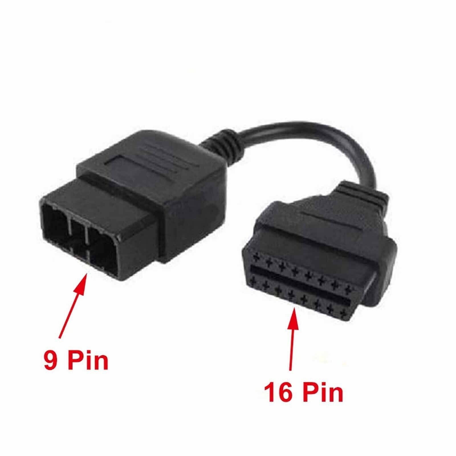 Connects a 16 pin OBD2 diagnostic tool to a SUBARU car with 9 pin socket.