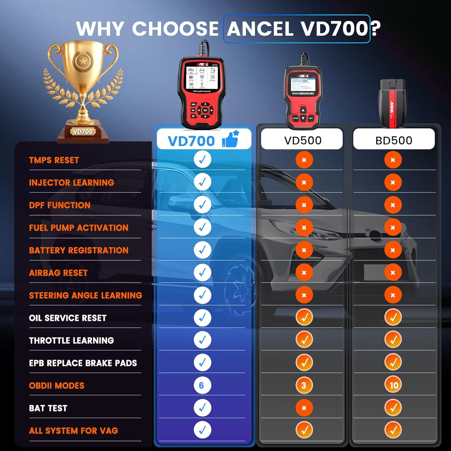 - 【No Hidden Costs, No Extra Charges】Tired of hidden charges? Unlike other devices that require additional fees, ANCEL VD700 offers 100% full access to all features, with no hidden costs. Help you enjoy peace of mind and save maintenance costs