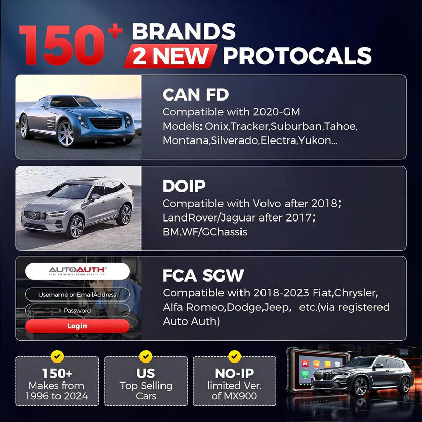 【NEW DoIP & CAN-FD, 150+ Brands Coverage】 You can always rely on Autel scanners: #1 car coverage in the industry, superior to most scanner cars. If you work on different makes/models worldwide, this 2025 Autel MK900 will satisfy you. It has the same vehicle coverage as advanced Autel scanners, 150 brands (EU/US/Asia), US top-selling models (1996-2025), FCA & Renault SGW, DoIP & CAN-FD (cannot be seen in two-way scan tools at the same level). NO-IP limited version of MX900.