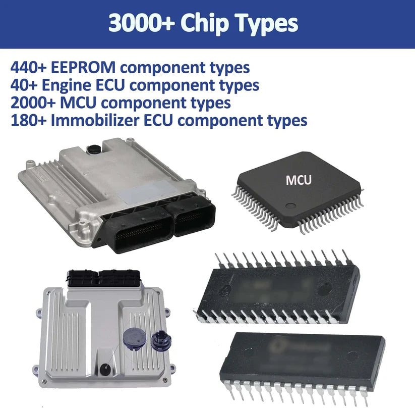 Supports data reading/writing of over 3,000 chip types (including EEPROM, engine ECU, MCU, IM.MO ECU). Over 440 EEPROM component types, over 40 engine ECU component types, over 2000 MCU component types and over 180 immobilizer ECU component types.