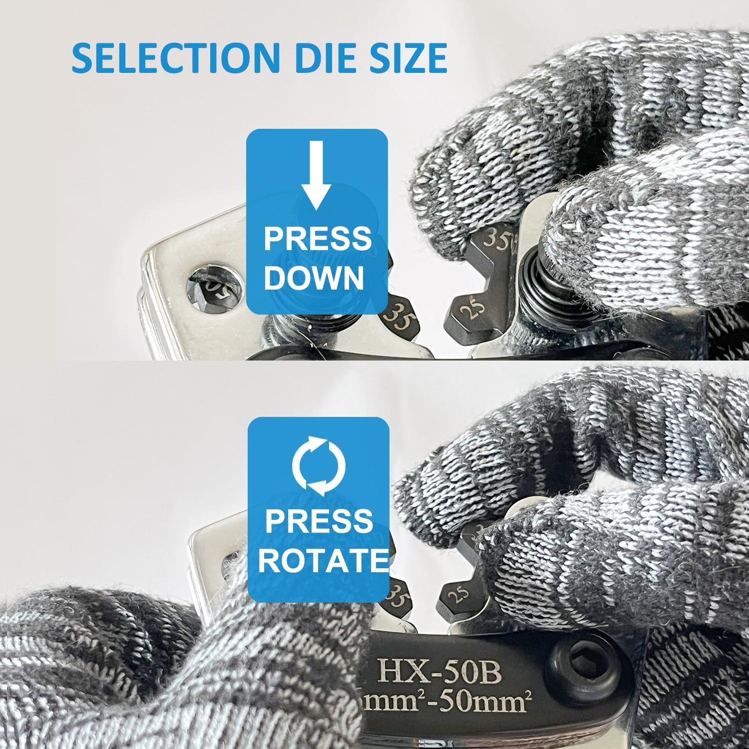- ROTATE CRIMP DIES: The professional cable terminal crimping tool has 6 mm²/10 mm²/16 mm²/25 mm²/35 mm²/50 mm² (Similar to AWG10 8, 6, 4, 2, 1/0) wire size crimping, using rotating heads with a spring-loaded locking pin to keep the heads in place