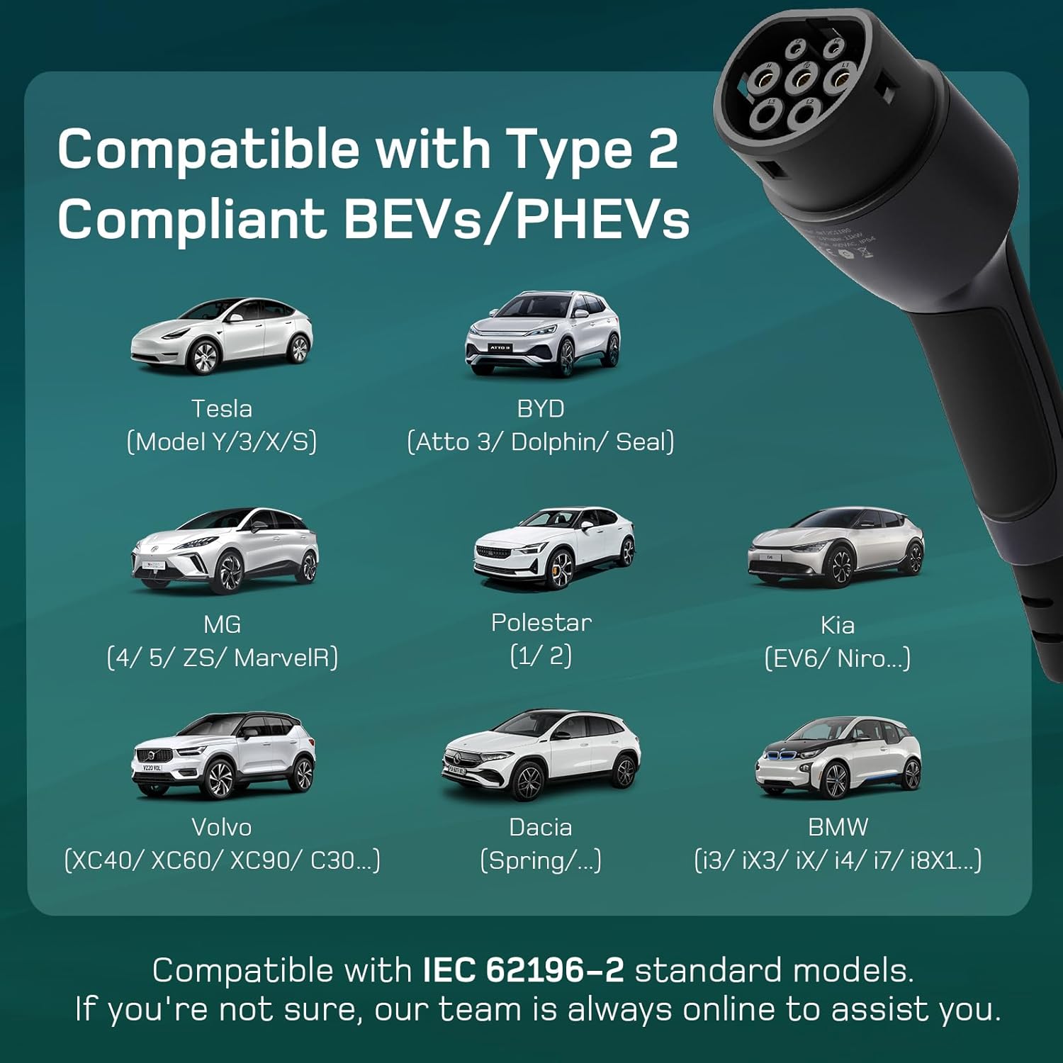 - 【Universal Compatibility】“dé” ev charger is compatible with the majority of vehicles equipped with a Type 2 plug such as Model Y/Model 3, Atto 3/Dolphin, ZS EV/HS, XC40/C40, EV6/Niro, Ioniq 5/Kona, EQA and other BEV/PHEV. If you have any questions or concerns about our product, don't hesitate to reach out to us. We're committed to providing you with the best possible solution and support.
