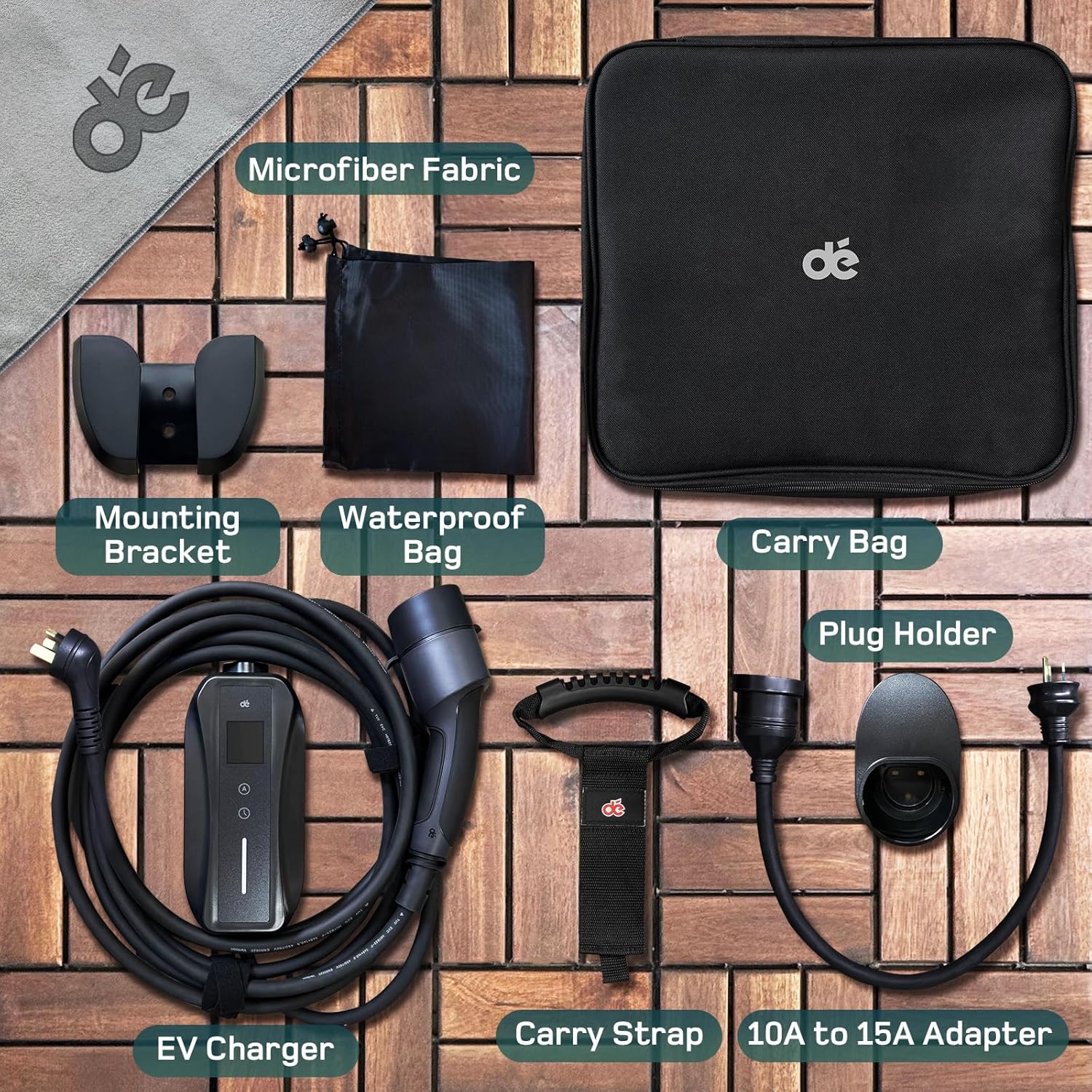 - 【All-in-One Package】The package includes a “dé” 3.5 kW Portable EV charger, along with a 10A to 15A adpter, waterproof cover, carrying strap, carry case, microfiber cloth and plug holder. The foldable bag fits neatly in your trunk without taking up much space, and the carrying strap adds convenience for transport or wall hanging. Plus, the microfiber cloth makes cleaning a breeze.