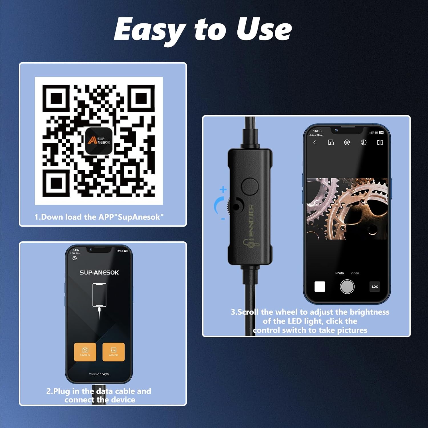 - Easy to use: Search "SUP-ANESOK" in the app store, download and install. Or scan the QR code and choose to download the APP. The pipe endoscope is suitable for Android 4.4+ and iOS 9+ and above systems. Drain endoscope does not require Bluetooth or WiFi connection, no need to charge separately, and no need to worry about connection errors. APP only obtains the device storage permission to store the pictures or videos taken by the endoscope. There is no networking function to upload private information. ATTENTION: If it does not work properly, please update the APP version.